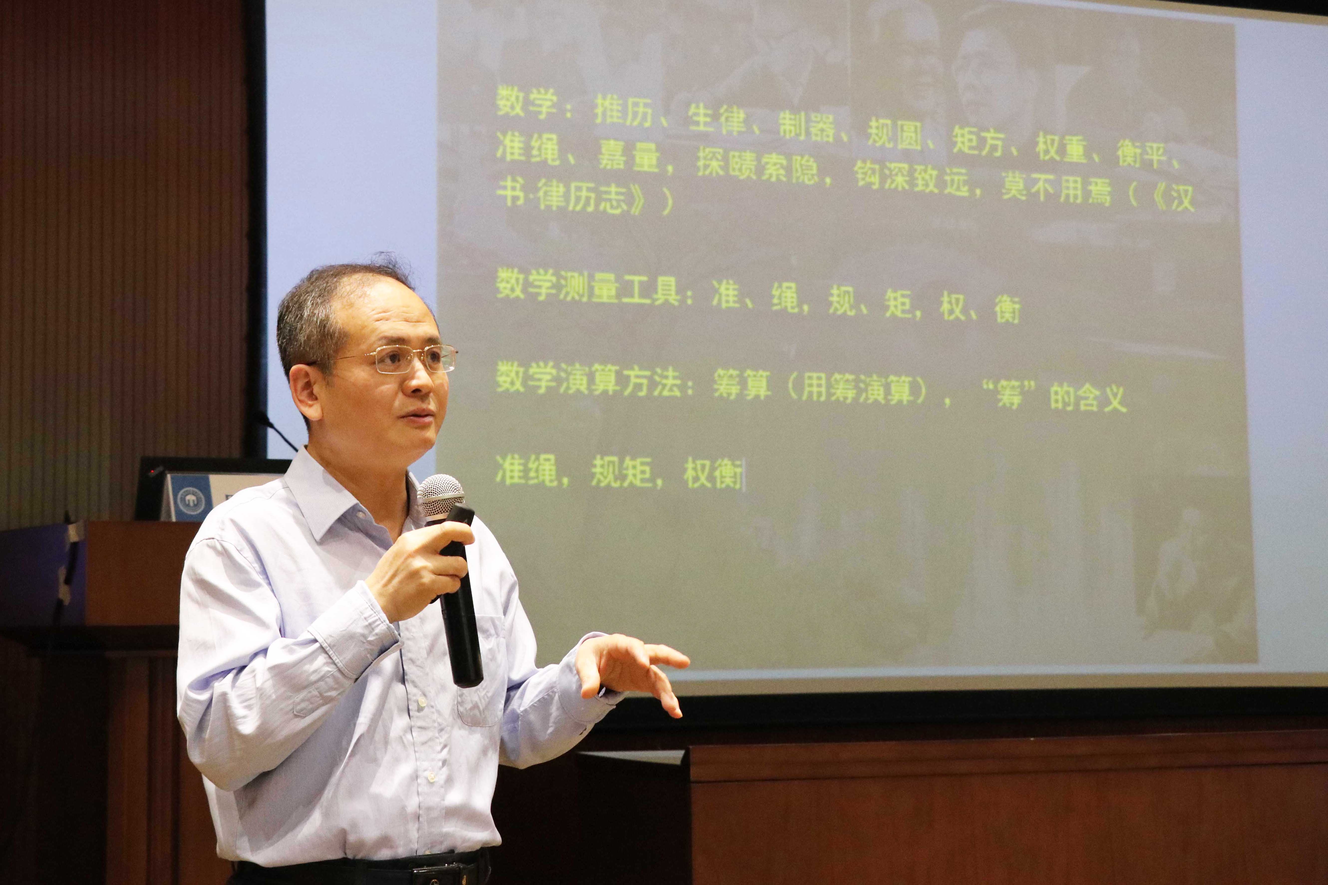 结束对复数“前世今生”的解读,周向宇从数的概念的演化、中国古代数学的贡献、筹算与国学的交融等角度,为听者打开了另一扇玄妙的大门。几千年前的十进位制、以筹计数、数学的用法和测量工具,在周向宇的通俗易懂的语言中生动立体起来。他引用大量包含“筹”“绳”等字的成语或古语,分享了从数学视角领悟中国文化、中国语言的独到见解,阐释了中国文化一贯以来对数学严谨、严格、严密、准确、精确的尊崇,对数学思想、方法、能力的看重,引发了在场师生对中国传统思想中所蕴含学术元素的浓厚兴趣。