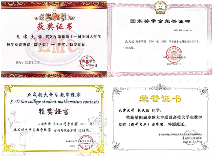 丘成桐大学生数学竞赛是由丘成桐教授发起的高水平学科竞赛,竞赛题目由丘先生领衔、世界一流数学家命题,难度不亚于世界顶尖大学的博士资格考。作为天大首批参赛者,武文治获得了第十二届丘成桐大学生数学竞赛优胜奖,让天津大学四个字首次出现在这一顶尖赛事的官方报道中。