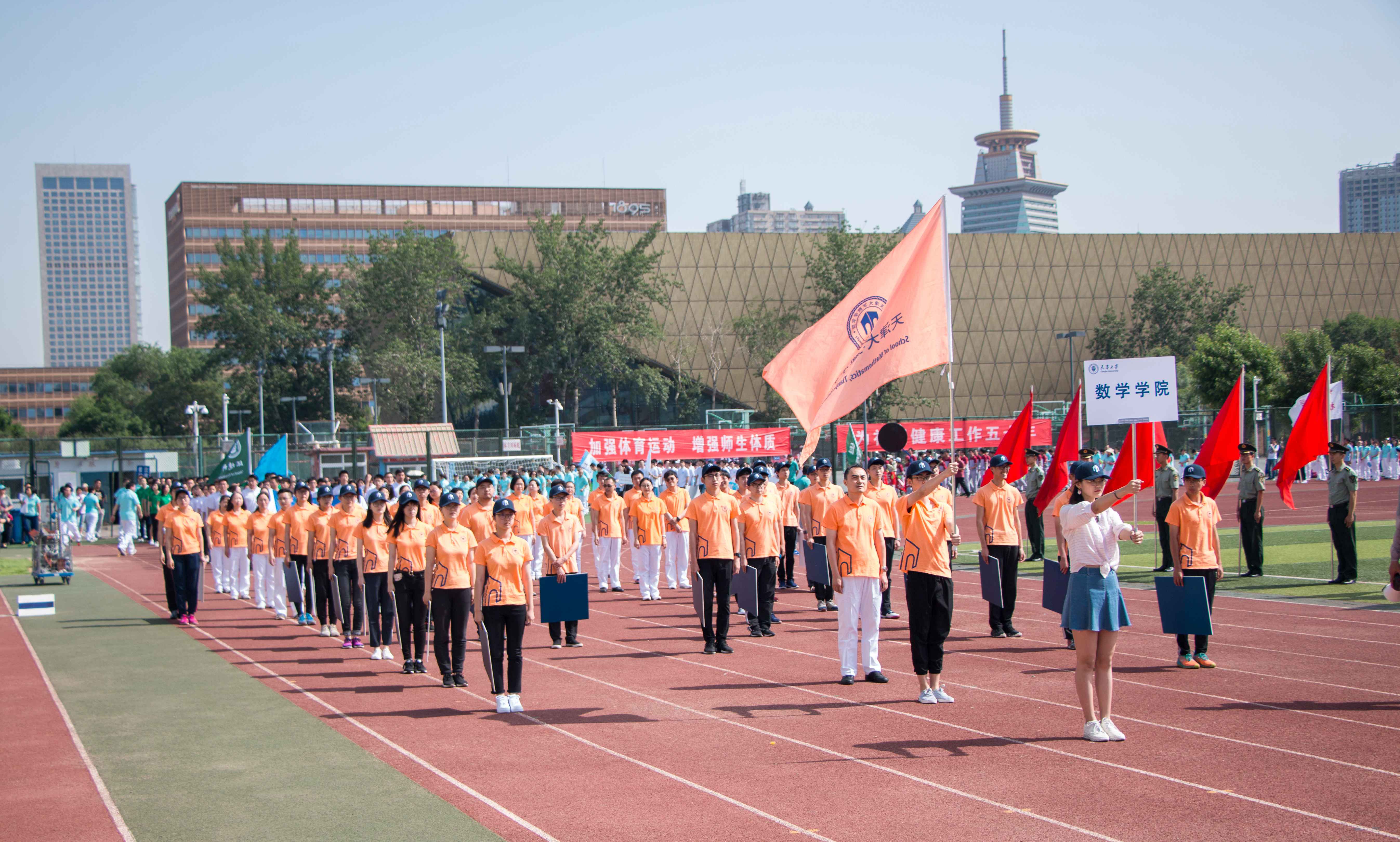 聚是一团火,散是满天星。开幕式上,数学学院橙色方阵由美丽的引导员雪伦带进会场。旗手崔永兴双手高举学院院旗,迎风挥动,虎虎生风。“一二一,一二一……”在邹雨龙洪亮的口号带领下,方队步伐整齐,声音嘹亮,士气高昂。我院队形是用数学求和符号∑(Sigma、西格玛)构成,i=1寓意一元复始,万象更新,n=629是学院全体师生的人数。正是由于全院师生的共同努力,才能造就天大数学的昨天、今天和明天。瞬时间,队形变换为数学学院院徽的特征图形M,这是数学英文单词的首字母,也是北洋大学堂45°剪影的形状,既体现数学特色,又彰显天大品格。微分天下,人生几何,科学之本,唯我数学!