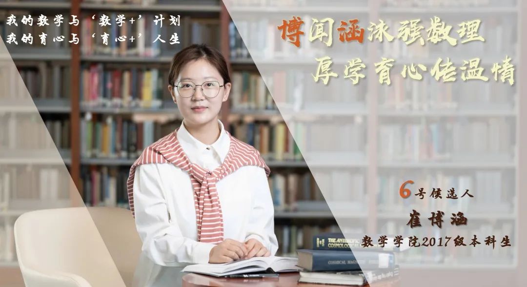 博闻涵泳强数理,厚学育心传温情。我是数学学院2017级本科生崔博涵。我有一颗热爱数学的心,我也用这颗心来拥抱世界。