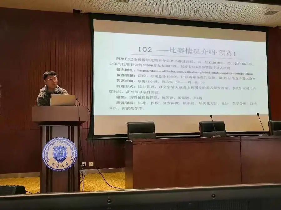 为鼓励在校生参加顶级赛事,培养拔尖创新人才,营造良好学习氛围,喜迎建党百年,3月14日上午,天津大学数学学院“数学文化月”之参加“顶级赛事”的师生师友们专题分享会,在北洋园校区1895A102报告厅举办。活动邀请到首届天津大学求是数学班(求是一期)班主任、应用数学中心副教授戴嵩,曾多次获全国大学生数学竞赛一等奖、卓越联盟大学生数学竞赛特等奖,并作为学院第一批参加丘成桐大学生数学竞赛(以下简称“丘赛”)的学生代表2018级求是数学班本科生刘子麒,以及就职于卓朗科技算法工程师一职,曾多次在数学竞赛中取得优异成绩,试水阿里巴巴全球数学竞赛的2016届基础数学专业硕士毕业生张况校友分别作主题分享。数学学院党委副书记许晶,团委、学工办辅导员出席活动。