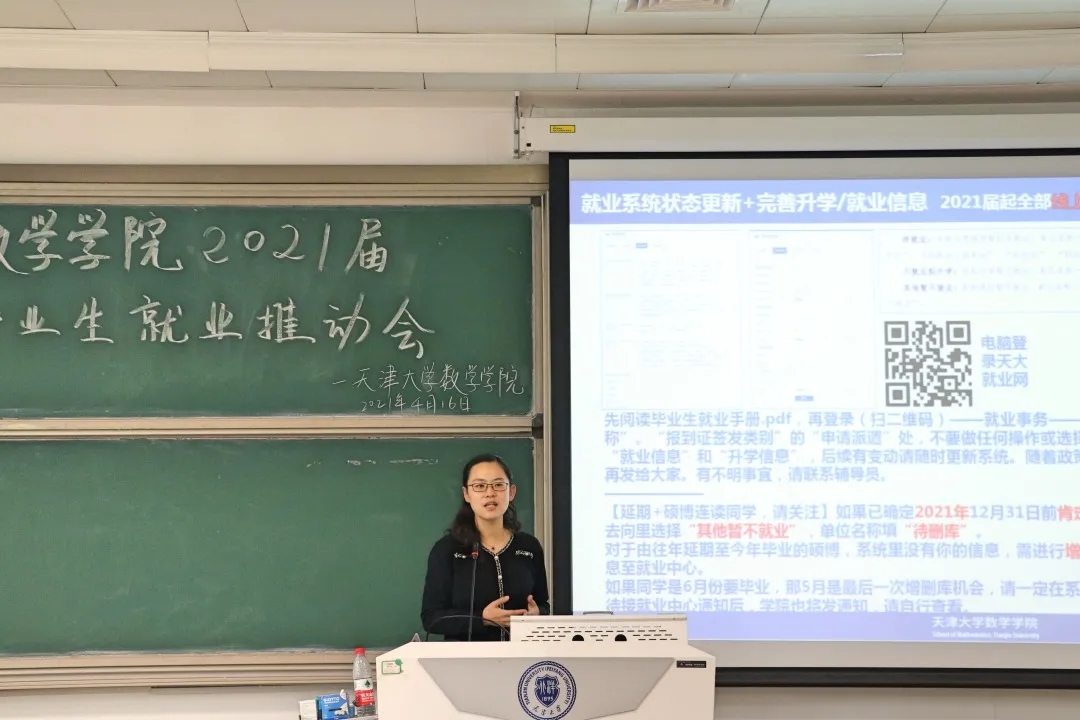 毕业生就业推动会由数学学院学工办主任、团委书记唐婧亚面向2021届应届本硕博毕业生主讲。她向同学们介绍就业系统的更新情况与使用方法、毕业材料领取相关事项以及毕业季系列活动的计划安排,提醒同学们关注优秀毕业生和求是奖评选,并欢迎同学们将求学求职经验分享给在校生以及21级即将入学的新生,将心得体会中彰显的奋斗精神接续传承。最后,她向全体同学尤其是非应届毕业生给出建议:希望同学们至少有一次实习经历,推荐同学们在没有办法外出实习的情况下最好参加一次线上职业体验。