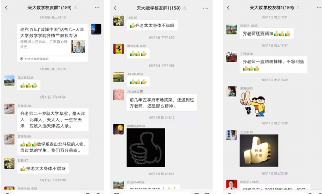 上次采访结束之后,齐植兰教授的经历深深感染了学院师生,同学们自发组织写信送给齐植兰奶奶,信中写到:“齐奶奶,您嘴边简单朴实的言语,对于我们就是力量的传承,虽然我们没有经历过食不果腹、战火连天、艰难困苦的时代,但是从您的讲述中,我们知道了,真的有那么一群人,在与党和国家共患难。从您的身上,我们汲取了正能量,也正是您这样的每一位共产党人,用信念和行动定格成了我们党百年的峥嵘岁月。我们也会带着您给予的力量走下去,去经历我们的磨难,去创造属于我们的新时代。” 2021年6月10日天津大学数学学院团委将齐老师的事迹和宣传视频发至数学学院各校友群和在校师生群,得到热烈反响,部分截图如下: