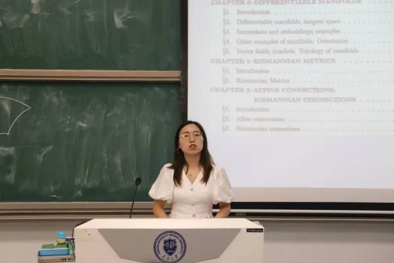 崔淑贤为同学们展示几何与拓扑书籍的目录,提出在学习时,遇到不太理解的内容,可尝试先记住,在今后的深入学习中,经过反复运用,将会增进对该概念的理解。在学习中要注重总结,熟知知识点的引入过程。