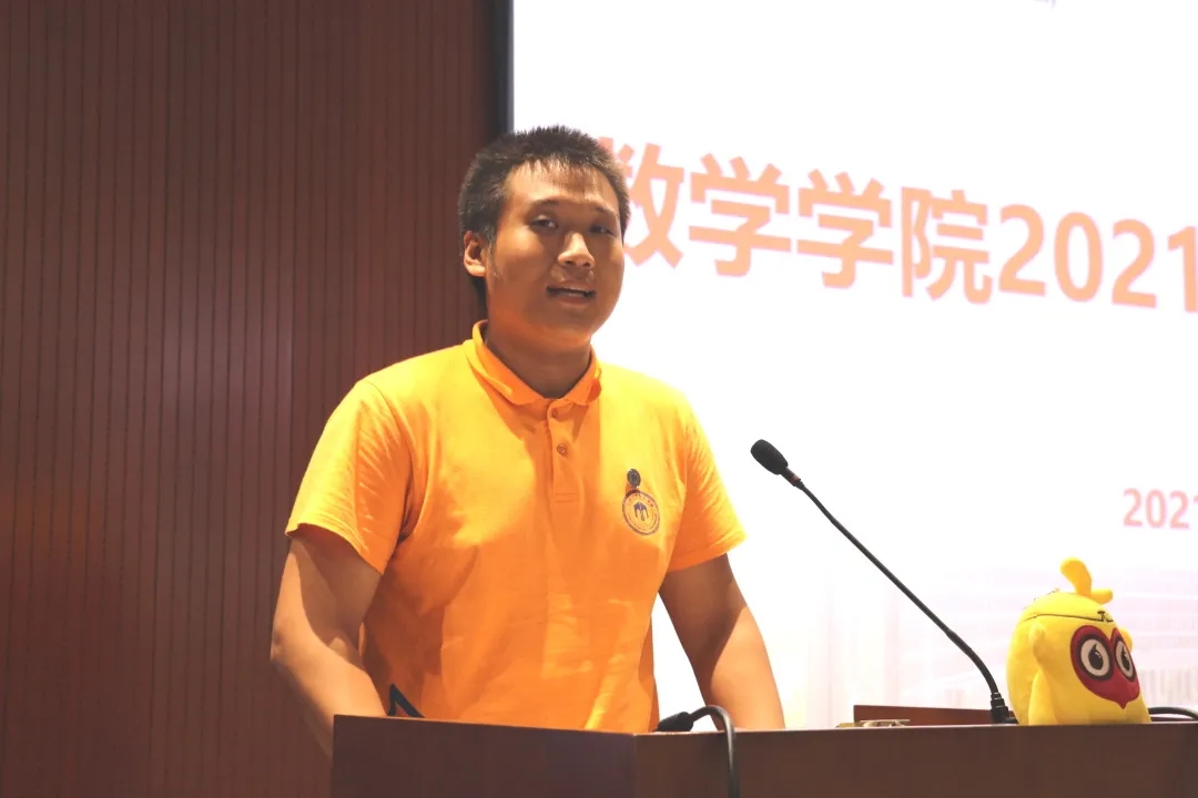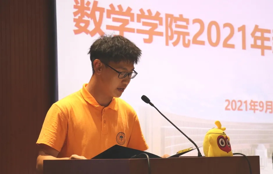 2021级本科生阳乐作为新生代表发言。他从自己了解到的天大数学历史讲起,表达出作为一名天大数学人的自豪与自信。他希望和同学们能够在未来的学习中严格要求自己,自强不息,以青春之我贯彻实事求是,以青春之我圆梦璀璨未来,以青春之我勇担家国大任。