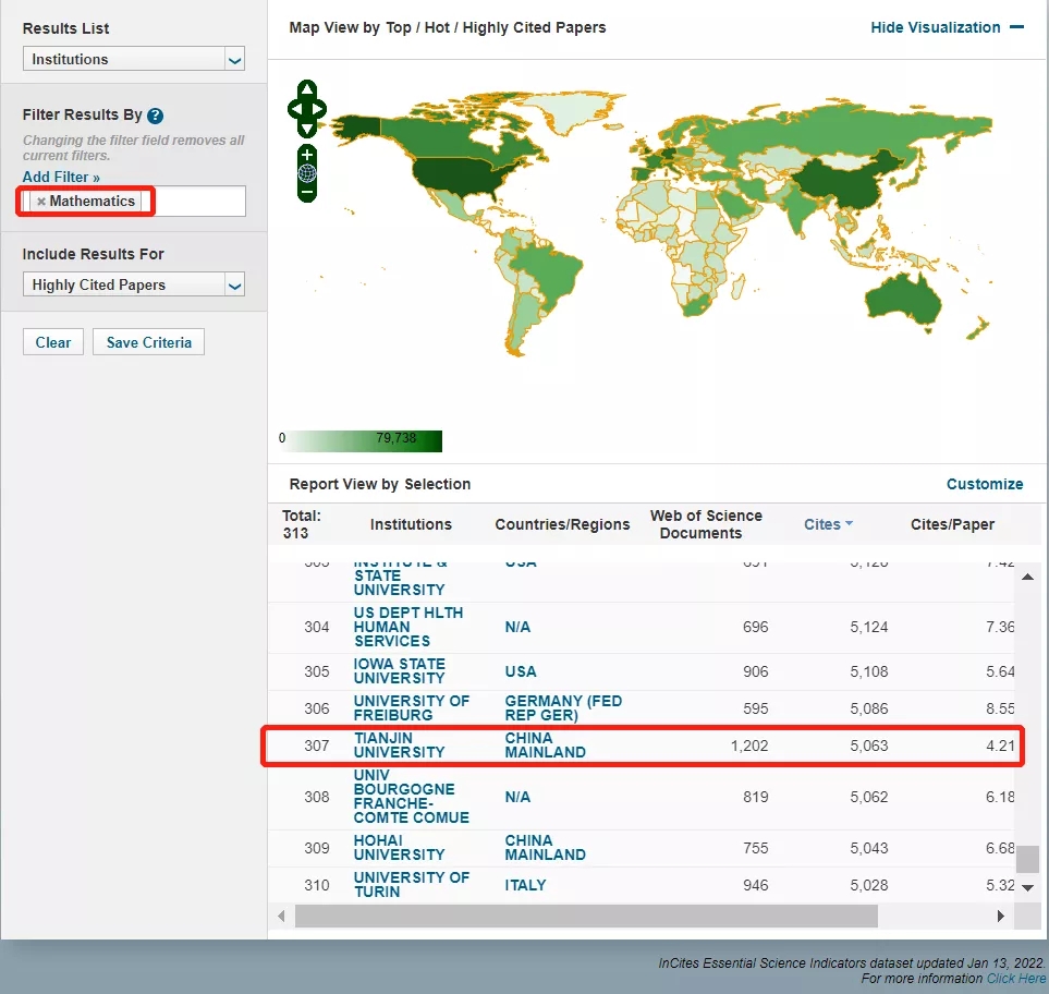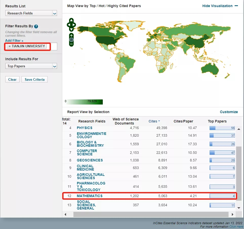 根据科睿唯安公司1月13日公布的最新一期ESI数据显示,天津大学首次进入ESI数学领域(MATHEMATICS)全球前1%,成为继化学、材料科学、工程学、物理学、计算机科学、环境与生态学、药理学与毒物学、社会科学、农业科学、生物与生物化学、临床医学、地球科学之后,天津大学第13个进入全球ESI排名前1%的学科领域。