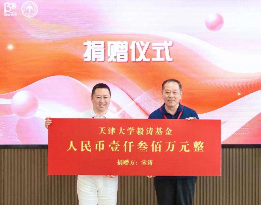 会上,1996级校友、米加集团创始人、董事长宋涛向母校捐赠“毅涛基金”1300万元,用于支持学校事业发展及数学学院、医学部、新媒体与传播学院建设,杨贤金代表学校接受捐赠。宋涛表示,在天大求学期间的知识积累是其事业发展的关键支撑,作为校友,支持学院发展、助力学校“双一流”建设是他义不容辞的职责。