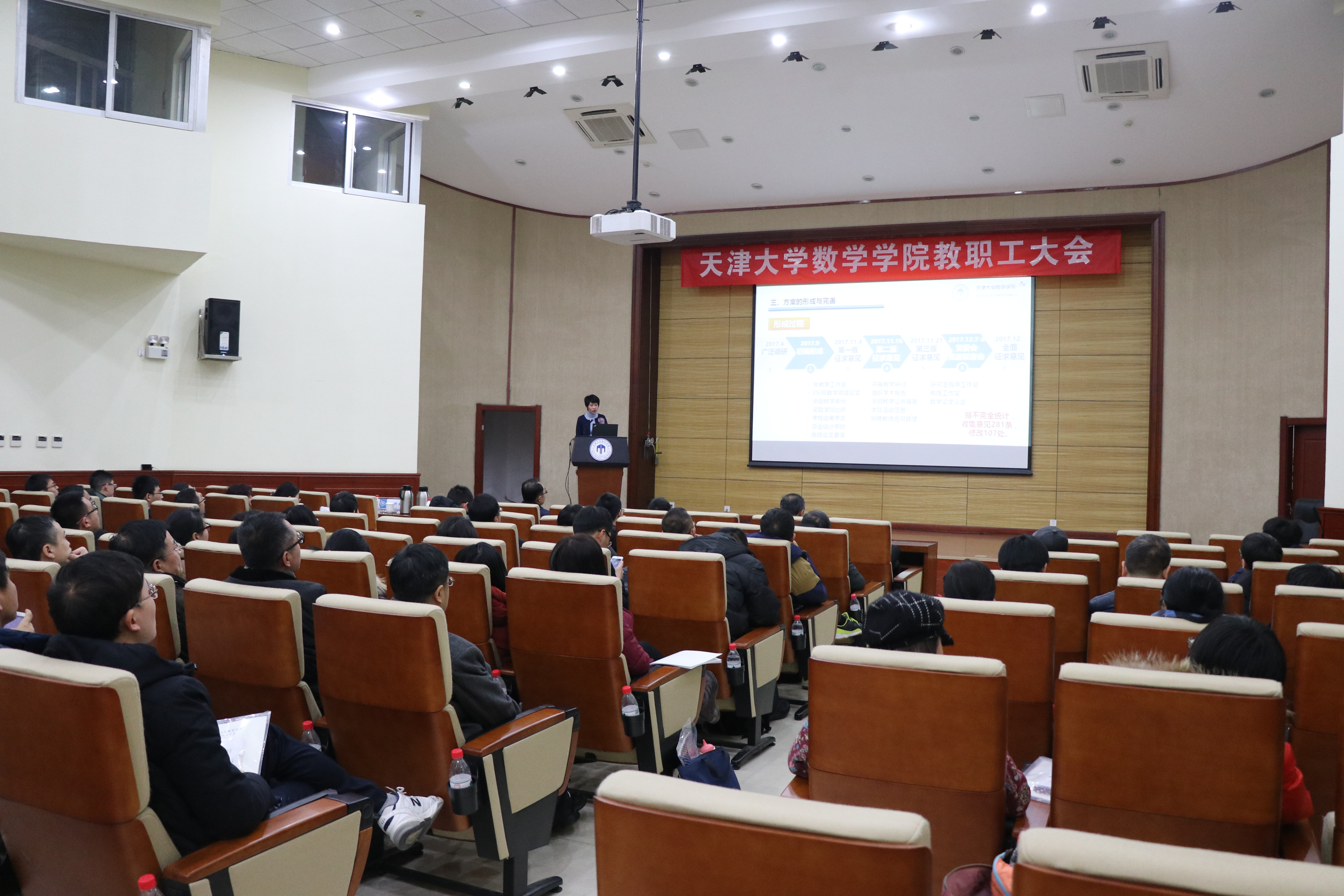 On the afternoon of December 15, 2017, the first faculty conference of the School of Mathematics was held in the report hall of the science library of Tianjin University. The leaders from the School of Mathematics and the faculty members from the School of Mathematics attended the conference. The conference was presided over by Sun Xiaotao, dean of the School of Mathematics.